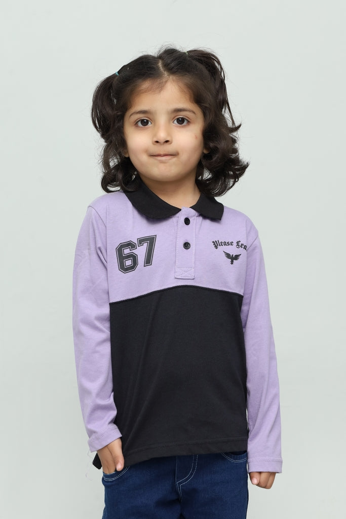 This fashionable kids polo t-shirt features a soft lavender and black color block design that gives a trendy and playful look. Designed for comfort and style, it is perfect for casual wear and everyday activities.