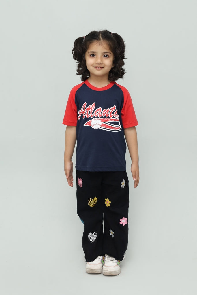 A sporty raglan-style t-shirt featuring a navy blue body with red contrast sleeves and bold “Atlanta” graphic print on the front. Perfect for an active and trendy look.